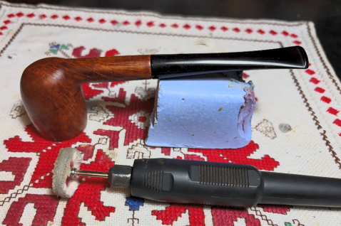 Now on the homestretch. After mounting a dedicated cotton cloth buffing wheel onto the rotary tool, with the speed set at about 40% full power, Blue Diamond compound is applied to the stem and stummel.