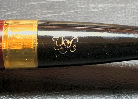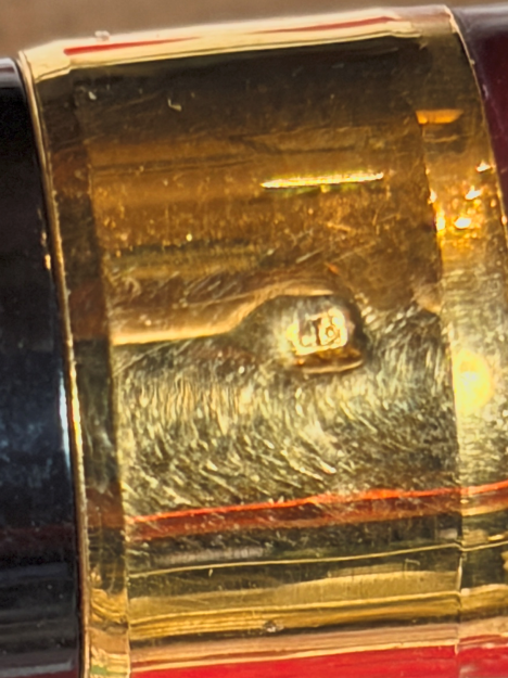 The band has a mark which is not a gold assay mark indicating pure gold, but a tiny stamp which would have a number in it indicating that this band is a percentage of gold – gold plated. After looking at it in a magnifying glass, my best guess is that the number is 18 but can’t be sure.