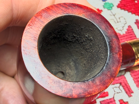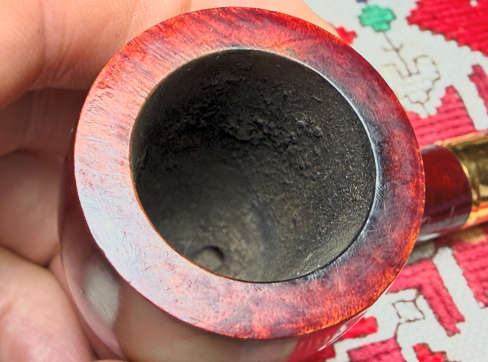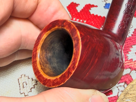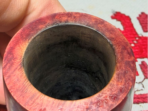 Since the rim was cleaned more aggressively because of the darkened briar, it has lightened. The smart bevel that was created has no color to it.