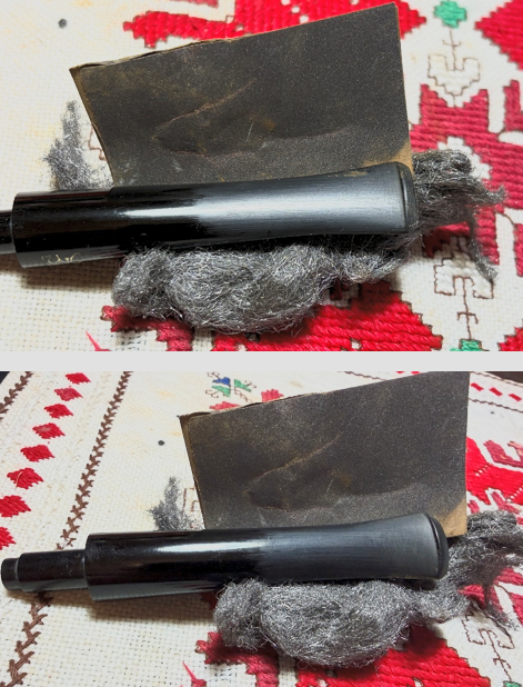 Next, the bit area is sanded with 600 grit paper and then 0000 grade steel wool is applied.