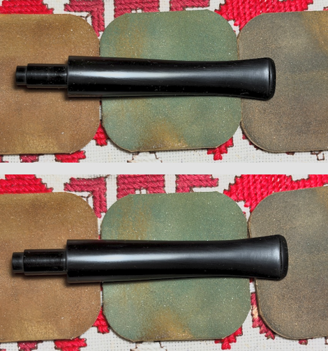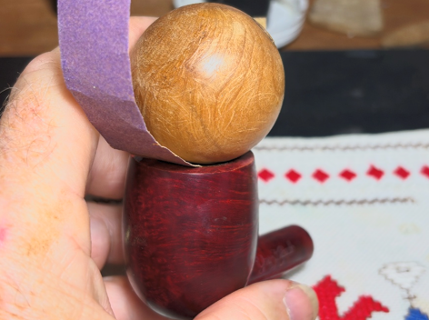 It’s time to reunite stem and stummel. I discovered that the tenon/mortise fit is way too snug for comfort. This happens sometimes after cleaning. To remedy this, 220 grit paper is wrapped around the tenon and then rotated several times and tested again in the mortise. This is done a few times to customize a fit that’s not too snug but not too loose. After a good fit is achieved, 600 grit paper is wrapped and rotated to smooth the acrylic tenon to help with the aesthetics.