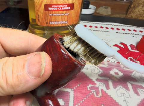 A brass brush helps to lightly scrub the rim to address the darkened briar from charring.