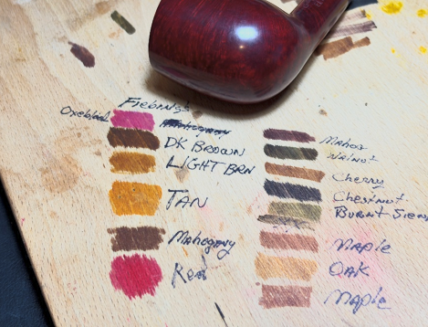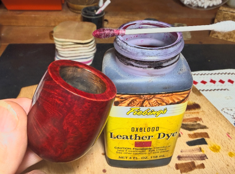 To touch up the rim and to have it match the rest of the stummel’s dark ruby red hue, I check out the color palette on the chopping board. The left column are all Fiebing’s aniline dyes and the right are dye sticks. The only contenders are the Fiebing’s Red and Oxblood Leather Dyes.