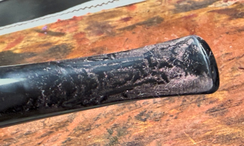 After applying the compound, the photo below shows the compound dust that’s generated during the compound application. This is removed by wiping the pipe with a felt cloth to prepare the pipe to receive the wax.