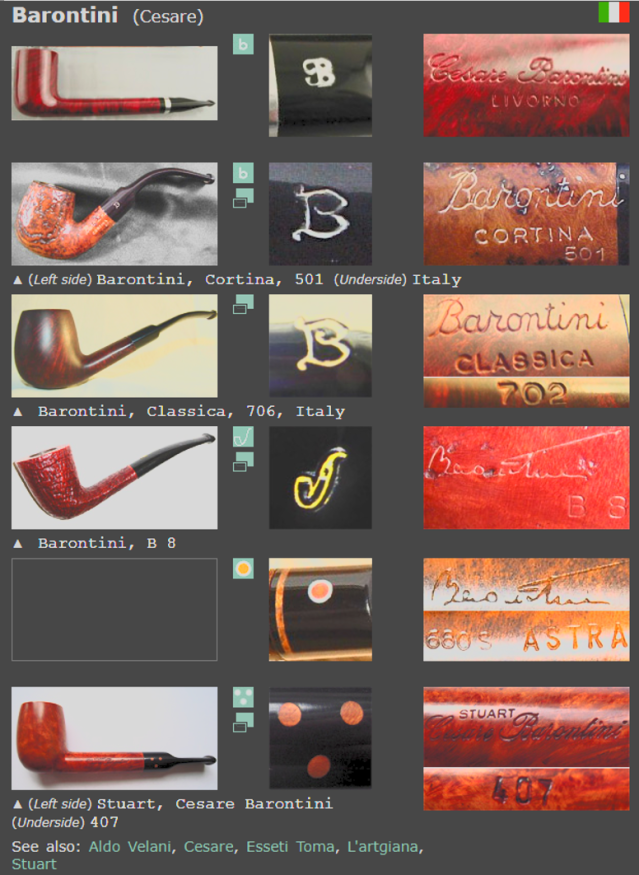 On the same Pipedia page is a photo of PipePhil’s information panels which I go to next (Baro-Bd — Pipes : Logos & Markings). It seems apparent from this panel that the pipe on the table was produced by Cesare Barontini and not by his cousin Ilio. In the second and third pipes below, both the ‘Barontini’ simple cursive lettering and the ‘B’ stem logo are identical.