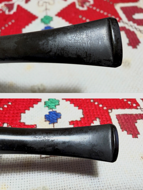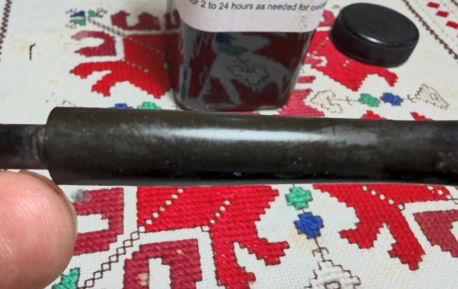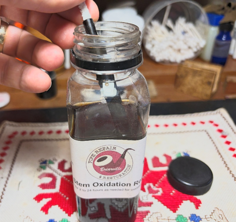 The stem has been soaking through the night to address oxidation. After fishing the stem out, this lightened photo shows the oxidation that was raised in the soak.