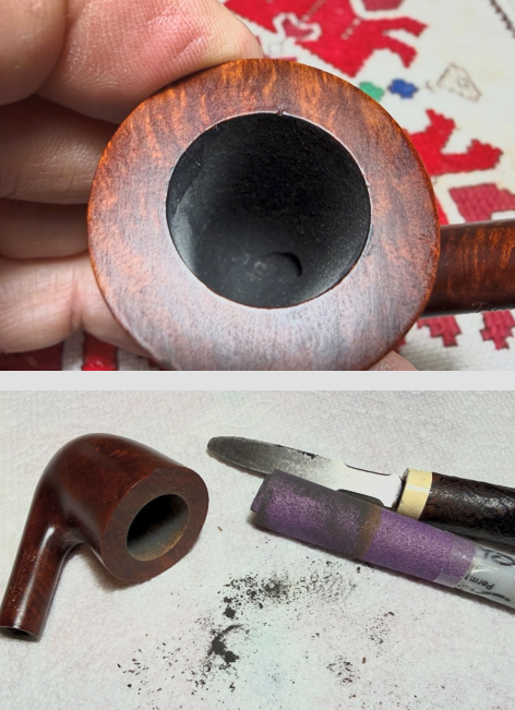 Switching now to the stummel, another picture of the chamber shows the unused condition. To clean what is there, the Savinelli Fitsall Tool scrapes the chamber wall and then the wall is sanded with 220 grit paper wrapped around the dowel rod. As the second photo shows, only a small bit of debris is loosed.