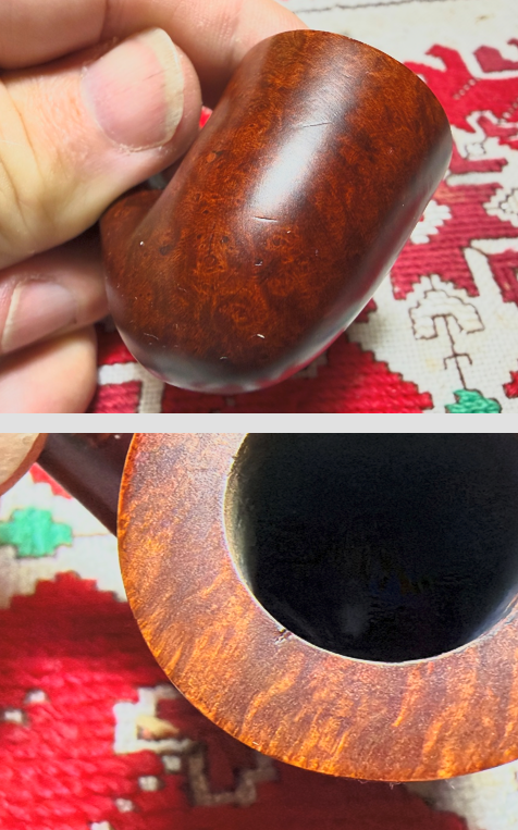There are dents and dings on the briar surface as well as a cut on the inner edge of the rim.