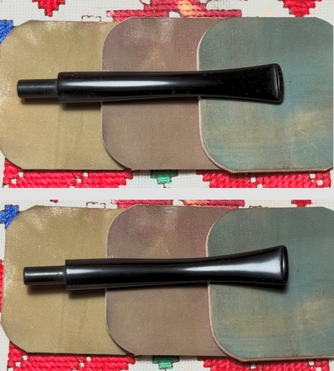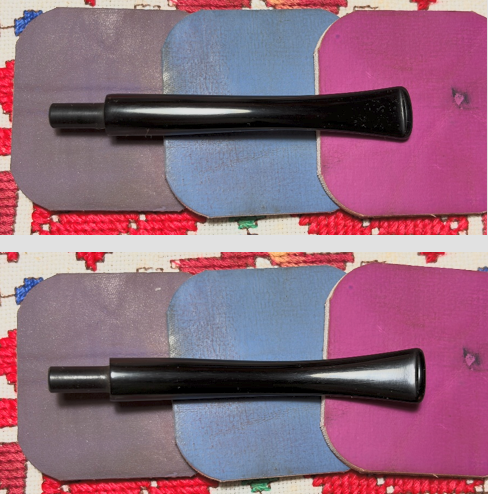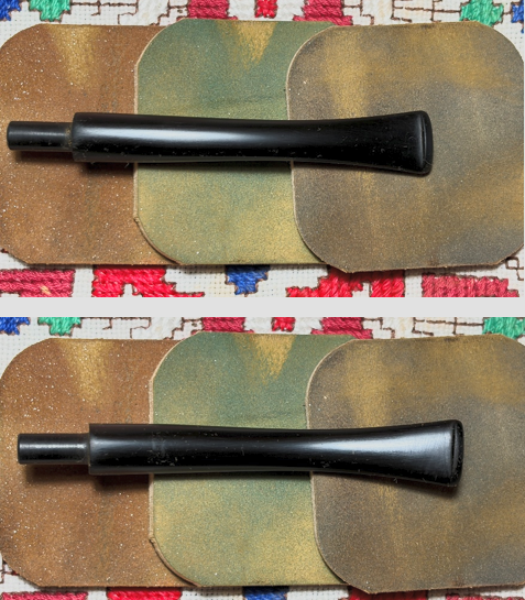 Next, micromesh pads are applied to the stem. Between each pad Obsidian Oil is lightly applied to the stem to guard against oxidation developing and to condition the vulcanite stem. The first set of 3 pads used are grades 1500, 1800 and 2400.