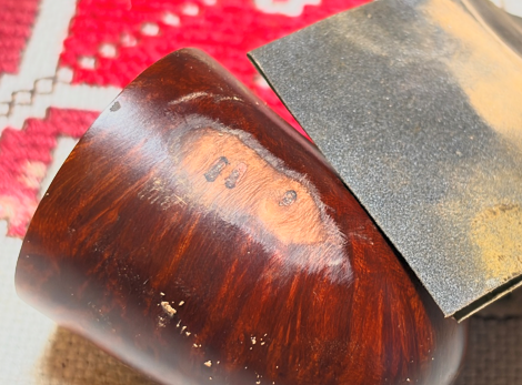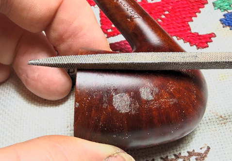 With the stem on the sideline, the focus turns back to the stummel. The 3 patches have cured, and needle files are used to file the patch mounds down flush with the briar surface. The goal is to keep the file on the patch and not to wander off and damage the surrounding briar.