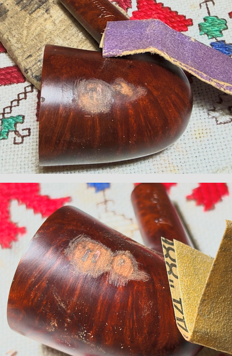 Using the sanding sponges, the areas of the nomenclature are avoided by the sanding. Also, the sponges are not able to effectively reach the crook where the shank and bowl meet.
