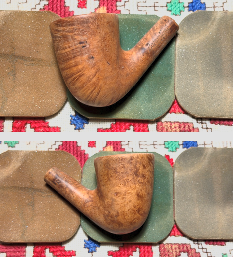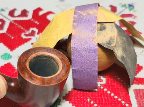 Next, the stummel is sanded/polished with the full set of 9 micromesh pads. Between each pad, the stummel is wiped with a moist cloth to remove the briar dust and to improve the effectiveness of the next pad. The first set of 3 pads are grades 1500, 1800 and 2400.
