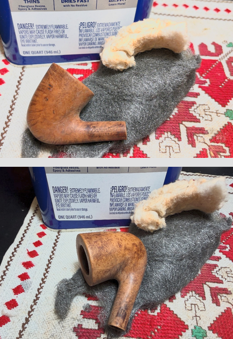 The stem is then rubbed aggressively with a cloth to wipe off the raised oxidation. A pipe cleaner moistened with isopropyl 99% alcohol is used to clear the airway of the Briarville Oxidation Remover fluid. Not shown in the picture below is the ‘B’ stem logo which appears have deteriorated in the soak and wiping away of the oxidation…hopefully it can be refreshed later.