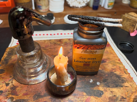 After the stummel is warm, Fiebing’s Light Brown Leather Dye is applied section by section with a folded pipe cleaner. As an aniline dye, after application of the dye to each section, while it’s still wet, the dye is flamed using the candle. When the flame contacts the wet dye, the alcohol combusts and burns off leaving the pigment behind in the grain. Systematically, the stummel receives the dye and it is flamed. A second go around of application and flaming makes sure the surface is thoroughly covered.