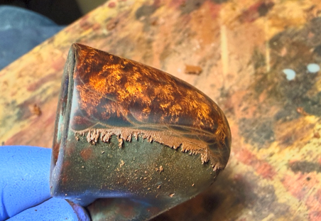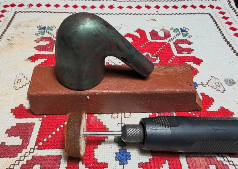 The next morning, the new dye rested through the night allowing it to settle in. To unwrap the flamed crust, a coarser felt buffing wheel is mounted onto the rotary tool with the speed at about 40% full power. The more abrasive Brown Tripoli is used to do the plowing.