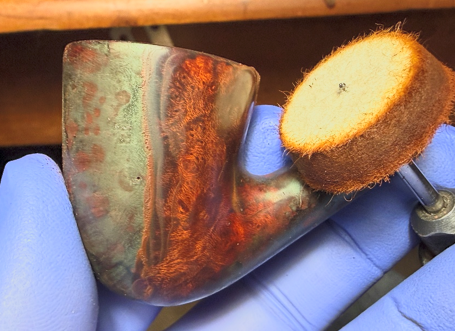 The entire process is slow taking over an hour to plow away the flamed crust revealing the briar beneath. When applying the dye, one never knows exactly how the briar grain will receive the dye until it’s unwrapped. The following pictures show the unwrapping in progress. The goal in unwrapping using the felt wheel and compound is to remove excess dye. The dye looks like splotches and as the felt wheel and compound work over the dark splotch, the excess dye is removed revealing the fine grain as it emerges. The grain almost appears luminescent. I like what I’m seeing.