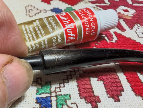 After the main plowing has been done with the felt wheel, the crook of the shank and bowl still has crusted dye. The felt wheel is not able to reach into this area.