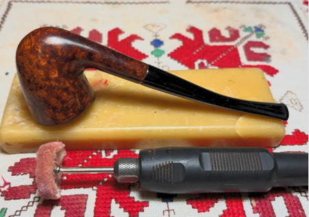 After the stem and stummel are reunited, another dedicated cotton cloth buffing wheel is mounted on the rotary tool with the speed remaining at 40% full power. Blue Diamond is then applied to the pipe.