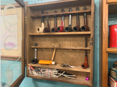 Then I looked through the glass and saw pipes nestled in a rack behind Sherlock. After opening the door, I found 9 pipes in the case along with various items and pipe paraphernalia. I was a bit confused because I was expecting to find a tag for each pipe, but there was only one tag, and it was attached to the knob of the case – one price for Sherlock and everything else inside. Truth be known, I would have purchased the case even if no pipes were waiting for me inside. This was frosting on the proverbial pipe cake!