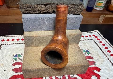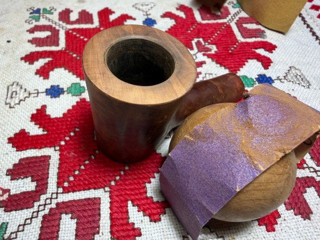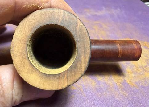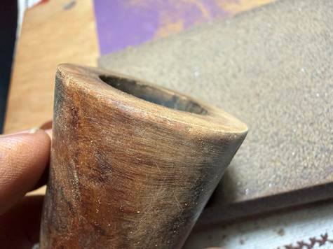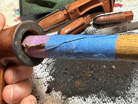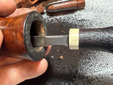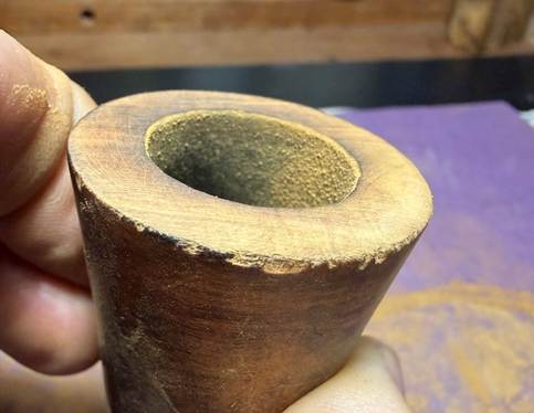 Following the reaming, the chamber wall is further scraped using the Savinelli Fitsall Tool and then sanded with 220 grit paper wrapped around a dowel rod.