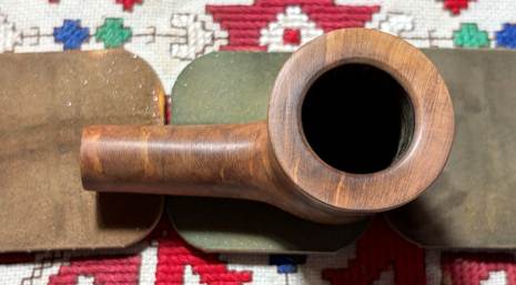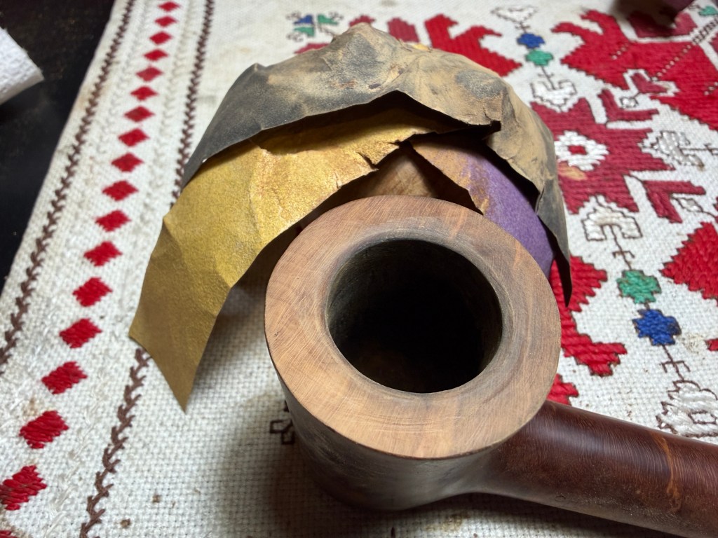 During the sanding of the rim, I noticed something I hadn’t noticed before. The shank facing has the remnants of what possibly was the original factory finish – a reddish hue. It brought to mind the picture I had posted earlier of a blasted Gilpin SPECIAL. The hue is similar. Unfortunately, this color will not be used this time around. The stummel will be receiving a new finish but not this hue.