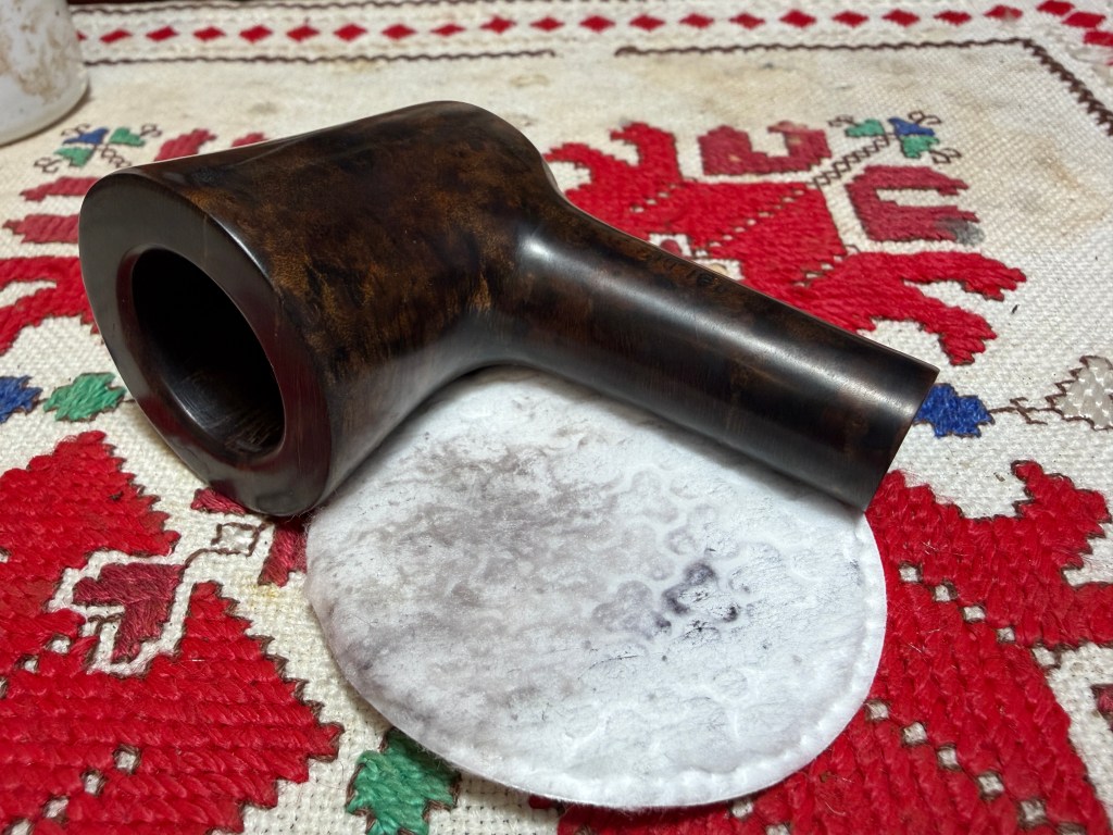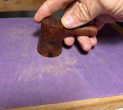After the application of the compound, the stummel is wiped down with a paper towel to remove crusted compound and then the stummel is wiped down with a cotton pad moistened with alcohol. This helps to remove more dye and to help blend the new dye application.