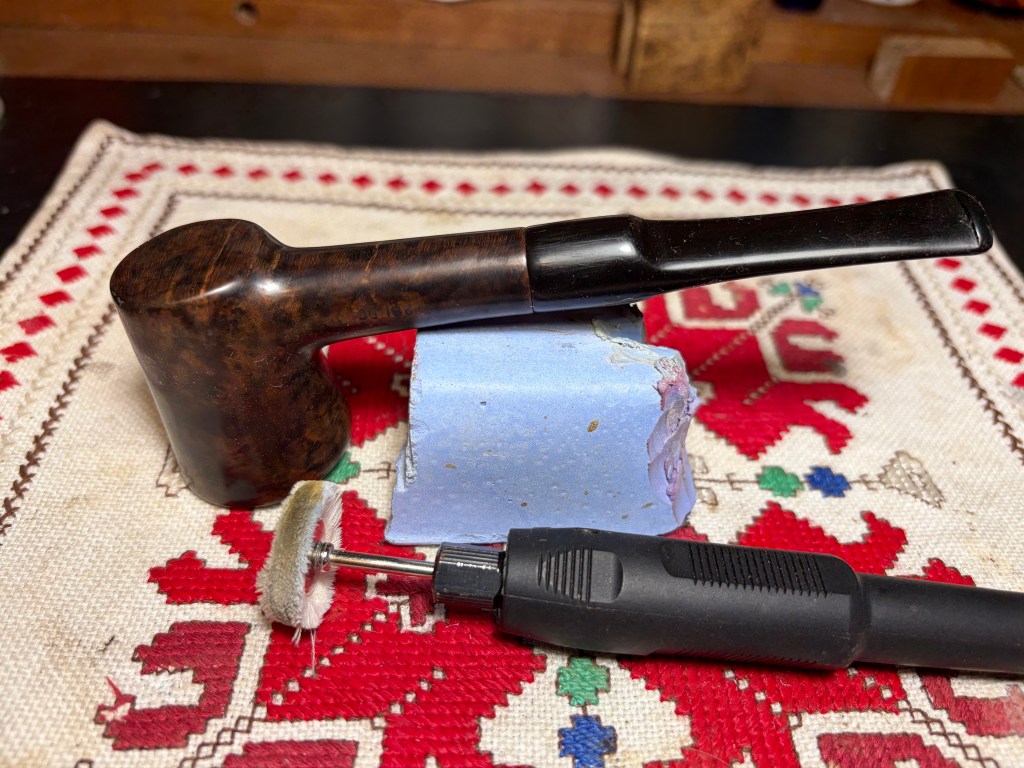 Following the Brown Tripoli, the stem and stummel are reunited and Blue Diamond compound is applied. Another dedicated cotton cloth wheel is mounted at about 40% full power.