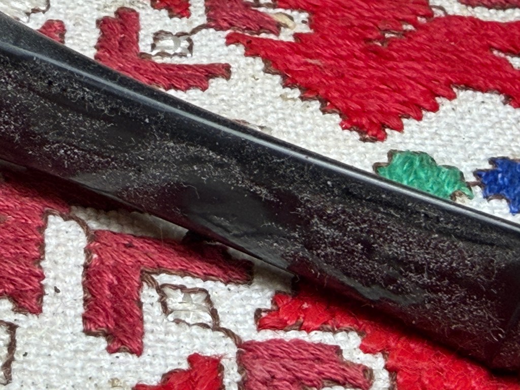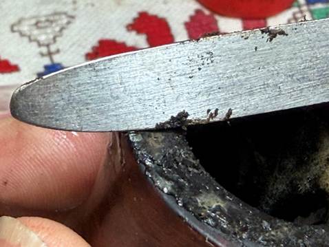The internal cleaning continues using pipe cleaners and cotton buds with isopropyl 99% alcohol. This project turns into quite the job. The internals are pretty gunked up. Using pipe cleaners and isopropyl 99% alcohol, I go to work. A small dental spoon is also helpful by scraping the mortise walls. Some of the nastiness is shown on the spoon…
