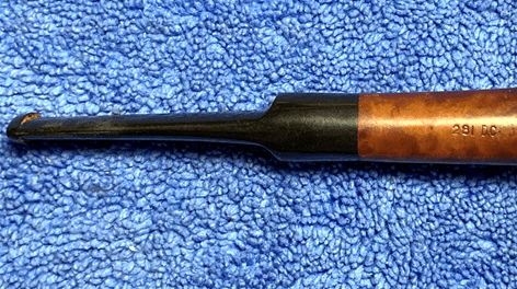 Starting with the stem, the airway is cleaned with pipe cleaners and isopropyl 99% alcohol. I figured out very quickly that the pipe cleaners were not able to pass through the slot which makes cleaning the stem a pain. To remedy this, the bit is warmed with the hot air gun while rotating. The pipe cleaner is inserted into the stem from the shank side and pressing against the tight slot area while heating.