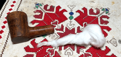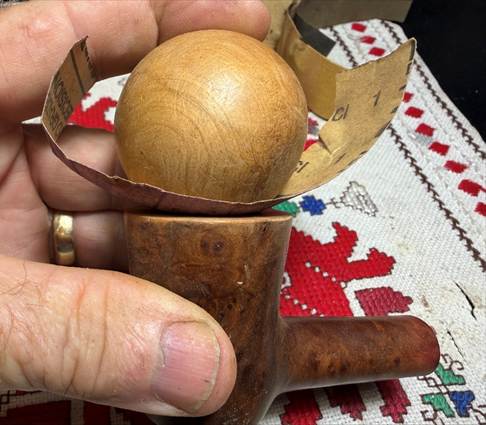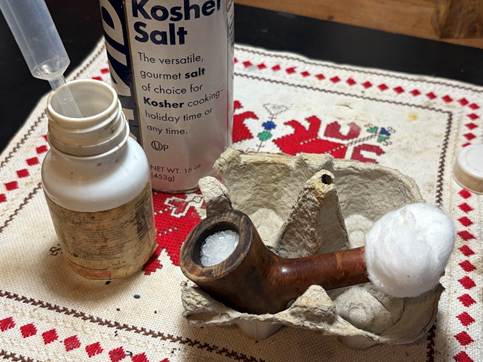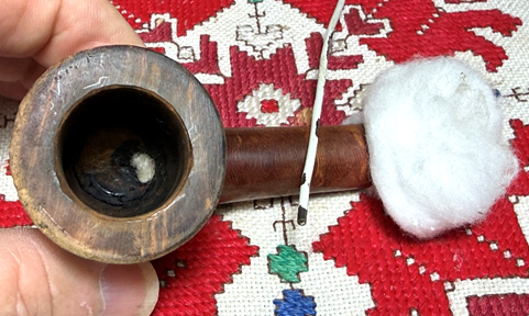 To continue the internal cleaning process an alcohol and salt soak is used. This is a soak that helps both to clean the internals as well as to freshen the briar. First, a cotton ball is pulled and twisted to form a wick of sorts that is inserted into the mortise through the airway. It serves to help draw out the tars and oils.