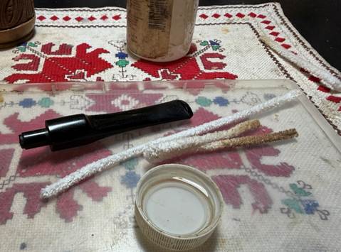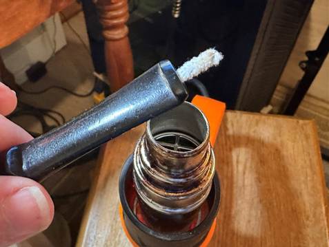 After the salt is cleared from the chamber, a few cotton buds and a pipe cleaner moistened with isopropyl 99% alcohol are used to confirm the cleaning process is done.