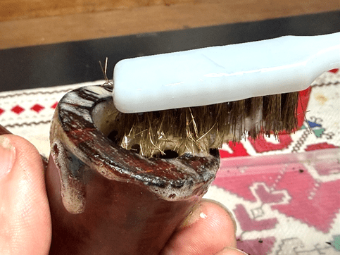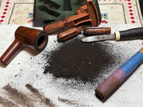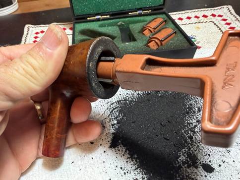 The rim is addressed using the edge of the Savinelli Fitsall Tool and also scrubbing with a brass brush. Brass is not as abrasive to the briar but adds the cleaning leverage.