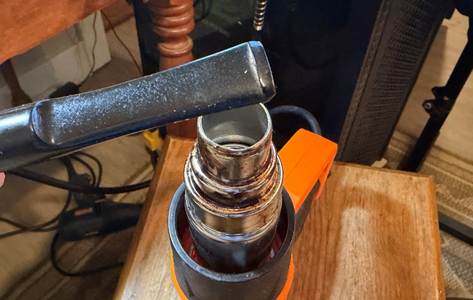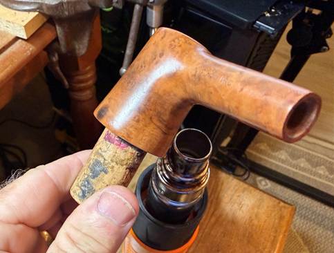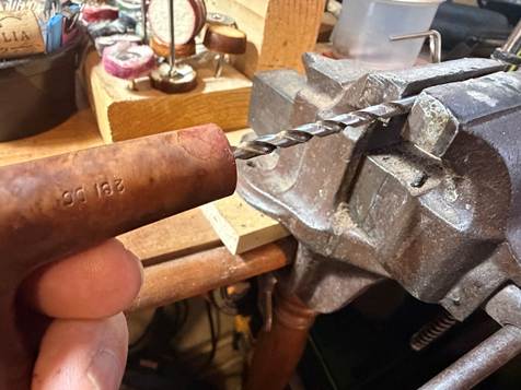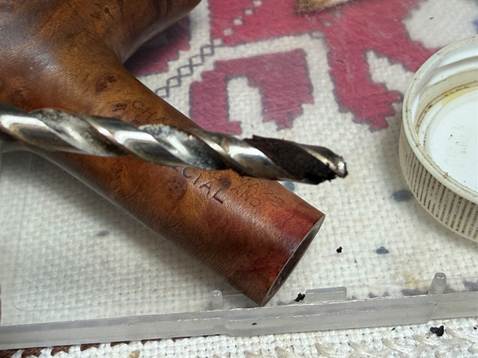 The airway is not coming clean too easily, so a drill bit is used to help. The bit is the same diameter as the airway. The bit is screwed into the mortise/airway and then pulled out. To do this the bit was mounted in a small table vise to hold it firmly in place. The stummel is then rotated and pulled off the bit (carefully!) to capture the gunk.