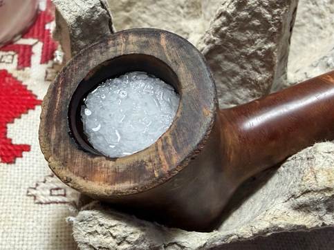Next, kosher salt is used to fill the bowl and then the stummel is set in an egg carton to keep it stable and at an orientation where the rim and end of the shank are roughly parallel.
