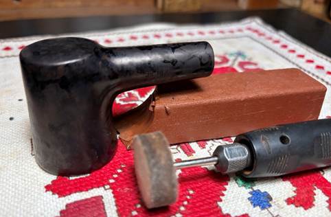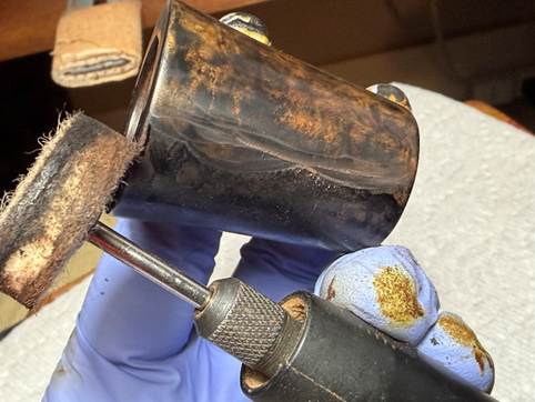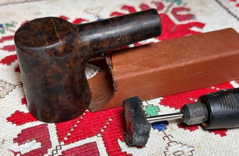 The next morning its time to ‘unwrap’ the crusted dyed surface. To do this, a coarser felt buffing wheel is mounted on the rotary tool and Brown Tripoli compound is applied. The goal of the ‘plowing’ with the coarser wheel and compound is to remove excess dye leaving only what has been absorbed by the briar grain.