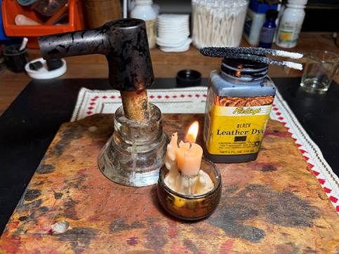 After the stummel is warmed, using a folded pipe cleaner as an applicator, the dye is applied one section at a time and then flamed with the lit candle. Fiebing’s is an aniline dye which means it is alcohol based. When the wet dye is ignited by the candle, the alcohol immediately combusts with a ‘whoof’ and burns off leaving behind the dye pigmentation in the briar grain. The application and flaming process methodically covers the entire surface. A second go around is done to make sure the application is thorough.