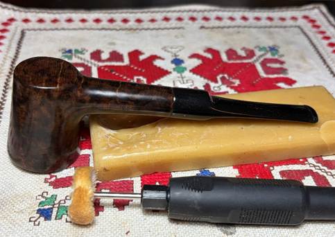 The final step is the application of carnauba wax. With another dedicated cloth wheel mounted on the rotary tool at the same speed, the wax is applied to stem and stummel. Following this, the pipe is given a rigorous hand buffing with a microfiber cloth to remove excess wax and to raise the shine.