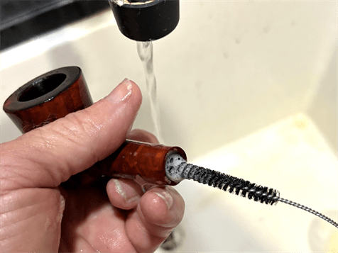 Next the stummel is taken to the sink to continue the cleaning of the internal briar. Using hottish water, the mortise is scrubbed with shank brushes and anti-oil liquid dishwashing soap – Dawn is my choice of soap. After scrubbing, the stummel is thoroughly rinsed and returned to the worktable.