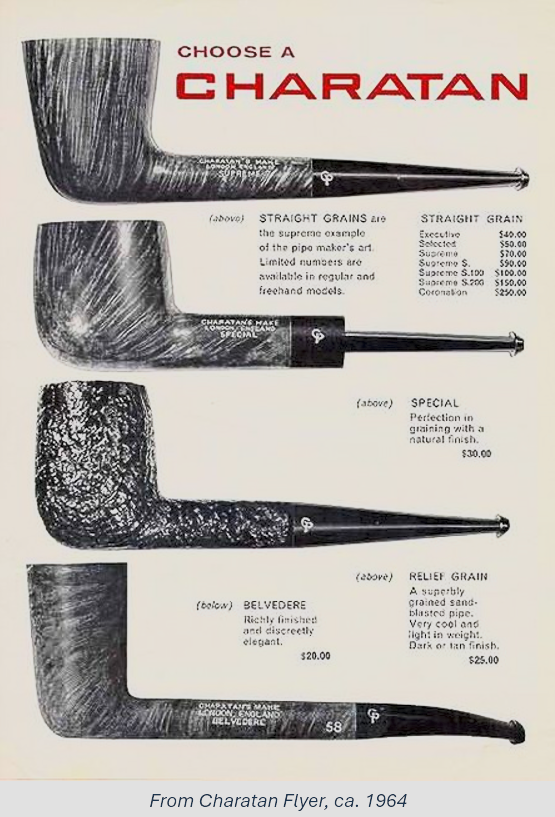 Charatan records are almost non-existent before Lane due to a factory fire, making it difficult to date pre-Lane pipes. Charatan used 4 basic grades prior to 1950: Supreme, Selected, Executive, and Belvedere. After 1950 Herman Lane’s influence began, and the grades started to expand. In 1955 Lane took over sole distributorship of Charatan in the US. In 1957 he introduced the Supreme S. Most of his other introductions were from the 1960s and early 1970s.