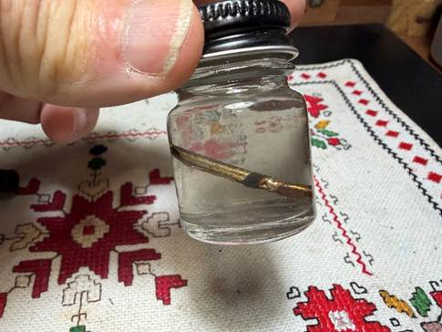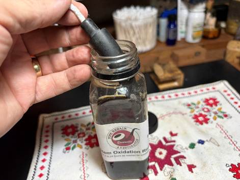To deal with any residual oxidation, the stem is then placed in a soak of Briarville Pipe Stem Oxidation Remover (www.Briarville.com). The stem will soak for several hours.