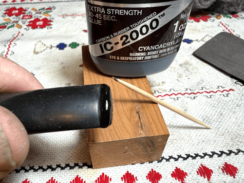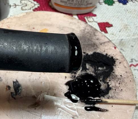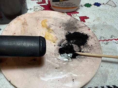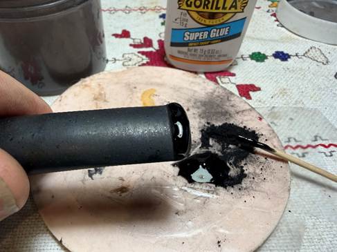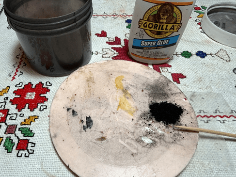 Using the toothpick, charcoal is pulled into the CA and mixed. More charcoal is added to thicken the mixture. It’s thick enough when it congeals to the end of the toothpick better and doesn’t run off as easily.