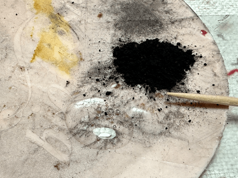 The decision is made to build up the button lips by applying a mixture of activated charcoal and clear CA glue. As before, scotch tape is placed on the mixing palette to help in cleaning. A small pile of charcoal is placed next to a small puddle of CA glue which is almost invisible in the picture below.