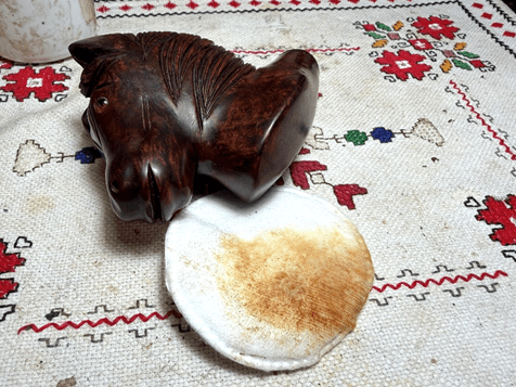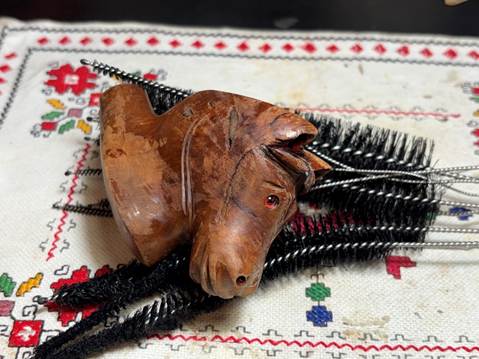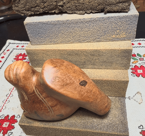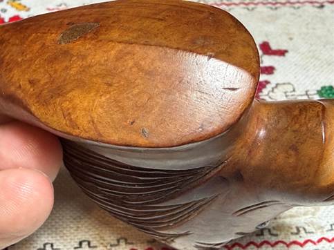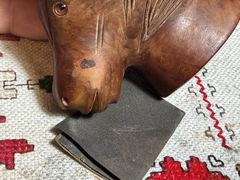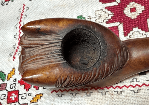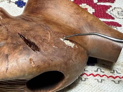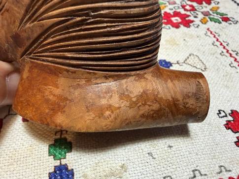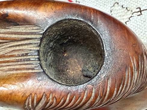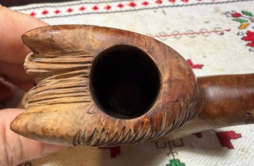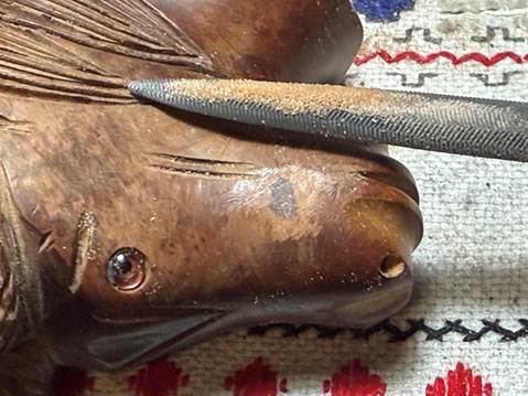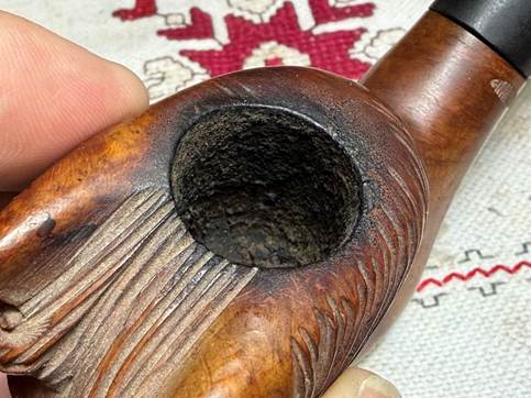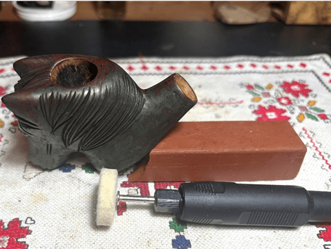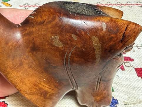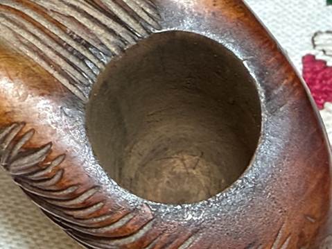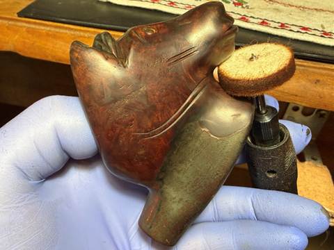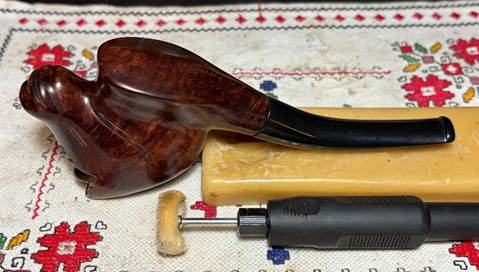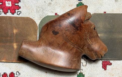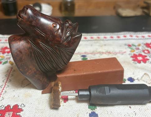 From what we have gleaned from the information, our Big Horse Figural was produced during the run of the Heirloom Pipe series most likely in the late 1940s and early 1950s up until the company was absorbed into Mastercraft in 1953. This pipe is definitely an heirloom. With a better understanding of the Marxman name and the pipe on the worktable, it’s time to look at the pipe itself. The chamber has some cake build up which will be cleared.