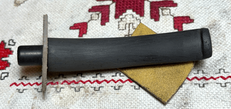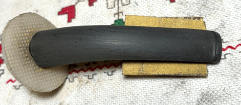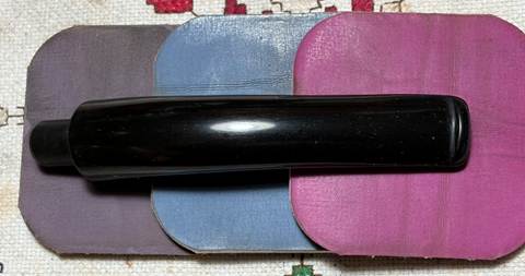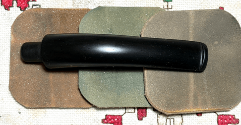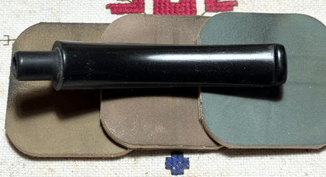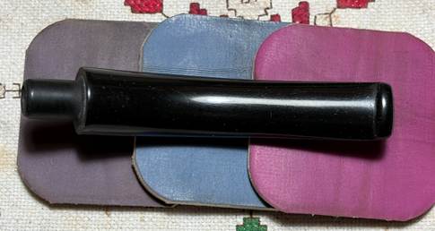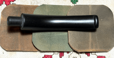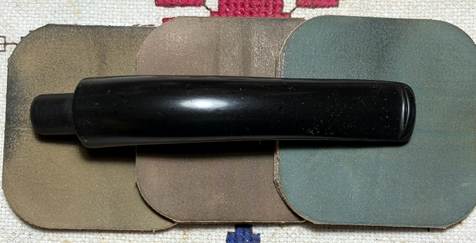The stem is waiting in the wings and the next step is the application of micromesh pads. During this phase the sanding transitions to polishing with the higher grade pads. To condition the stem and to guard against oxidation, between each pad Obsidian Oil is lightly applied to the stem. The first set of pads are grades 1500, 1800, and 2400.