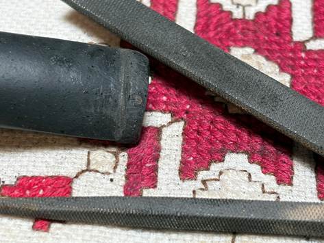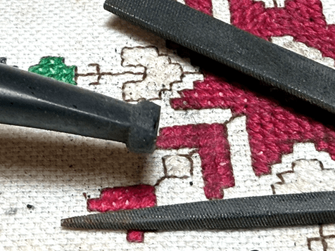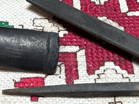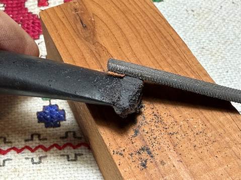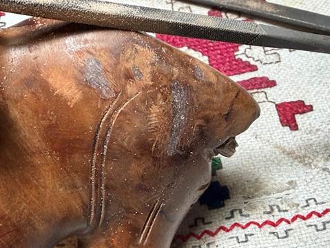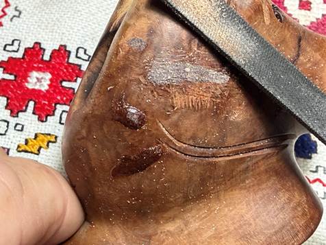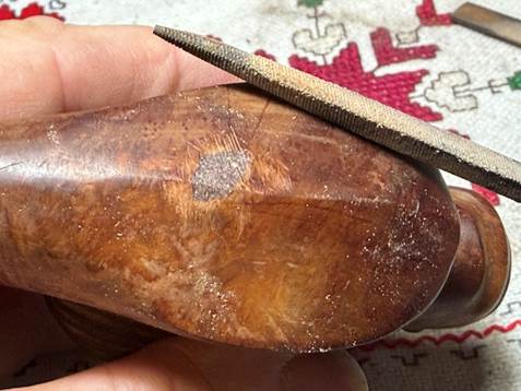 Before continuing with the stem work, focus is switched back to the stummel. The huge fills have cured, and I go to work on filing them down flush with the briar surface. Needle files are used to do the job. The picture below shows two fills filed and 2 up next.