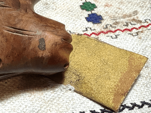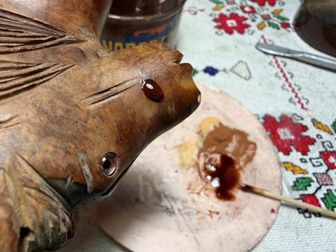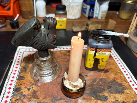 The dye is then applied with a folded pipe cleaner as an applicator. The wet aniline dye is painted on a section at a time and then flamed with the lit candle. The alcohol in the dye immediately combusts and burns away leaving behind the dye pigment. Special care is taken to make sure dye reaches all the sculpted grooves and holes.