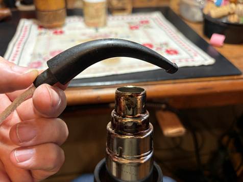 To loosen the slot and widen the bend a bit, the hot air gun is used to warm the vulcanite stem and button. While heating, a pipe cleaner is inserted as far as it will go from the shank side of the stem. As the rubber warms it becomes softer and the stem bend is able to open a bit. I had noticed earlier that the stem bend seemed to be a bit tight in relation to the stummel. Since I need to warm the vulcanite to open the slot, I decide to open the bend a bit – not much.