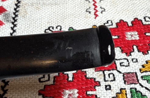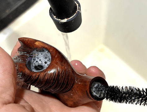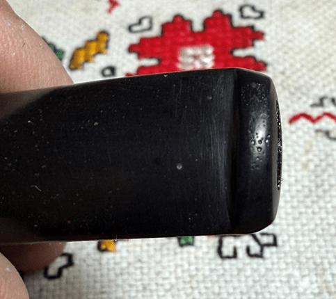 Next, the stem airway is cleaned with pipe cleaners moistened with isopropyl 99%. Well, I used a couple of the pipe cleaners and neither one was able to successfully pass through the stem. The stem bend and the slot are tight. I wasn’t able to start a pipe cleaner through the slot.