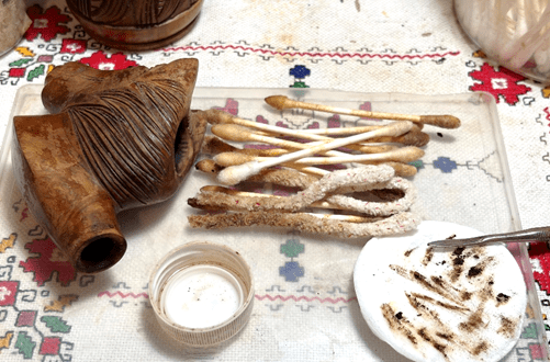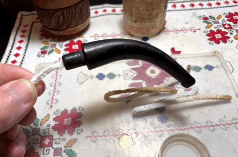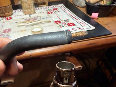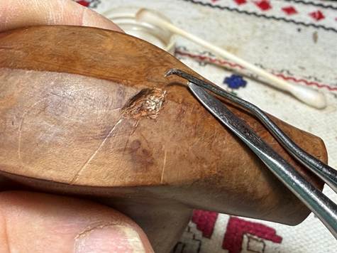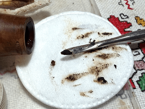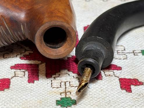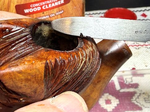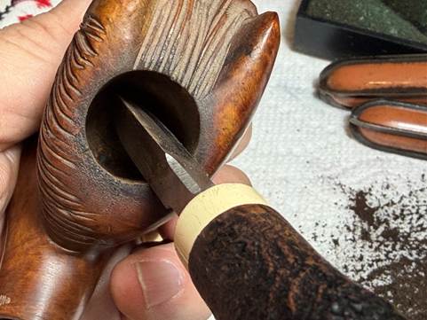 Before looking at the results of cleaning the external briar, cleaning continues on the internal briar with pipe cleaners and cotton buds. A small dental spoon is useful scraping the mortise removing tars and oils that collect inside.