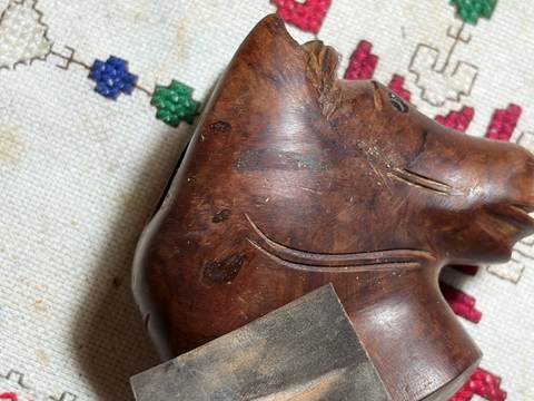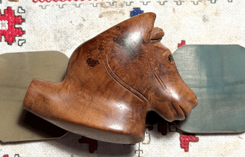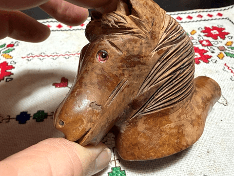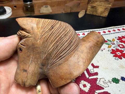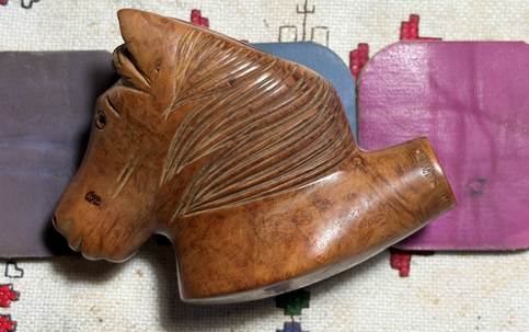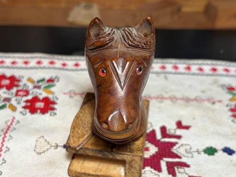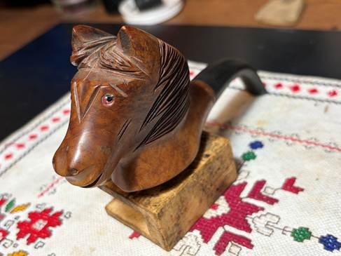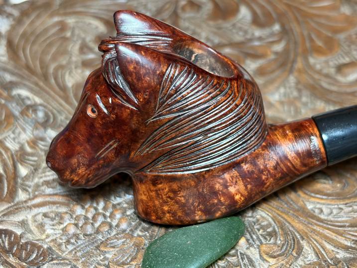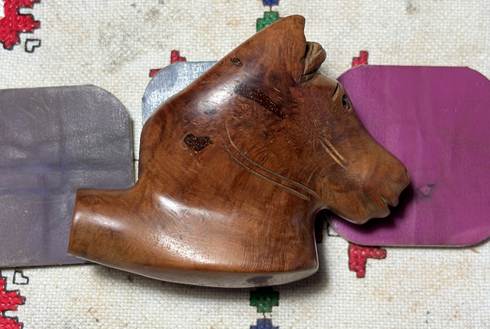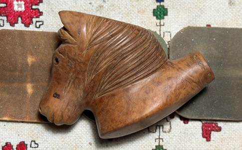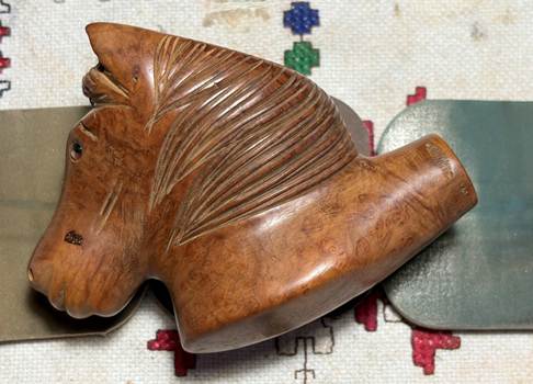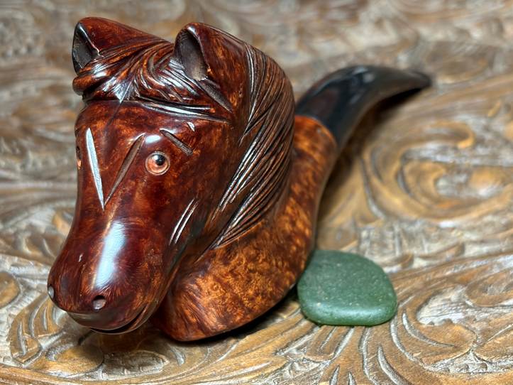 Richard is the father of Elsbeth, our next door neighbor. When he came to my house to show me the Micoli, I had the box of Corey’s pipes on the table as pictured above. It wasn’t my intent to put such a powerful temptation in such an obvious full view, but Richard started looking and a few pipes whispered to him – the Marxman and the very diminutive Cup Pocket pipe which is sitting at an angle in the lower right corner pictured above, next to a pair of very old Yellow Boles with the classic logos embedded in the shanks rather than the stems. As we discussed the pipes, in the end Richard gave in and commissioned both pipes. Richard also appreciated the fact that a portion of the proceeds of all pipe restored help to support the Daughters of Bulgaria, now called Spring of Hope, a ministry that my wife and I co-founded when we lived in Sofia, Bulgaria. The focus of the Daughters of Bulgaria was to help women and girls who had been trafficked and sexually exploited. Today, these efforts continue along with creating prevention programs for those most at risk. The dimensions of the Marxman Figural is Length: 6 1/2 inches, Height: 3 5/8 inches, Lateral rim width: 1 1/2 inches, Chamber width: 3/4 inches, Chamber depth: 1 1/2 inches. Here are pictures of the Marxman Big Horse Figural that got Richard’s attention.